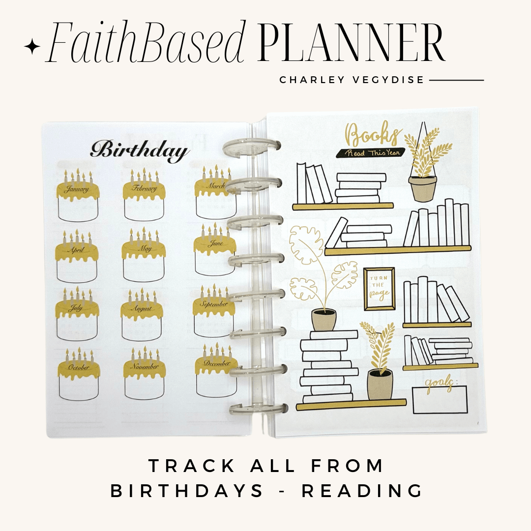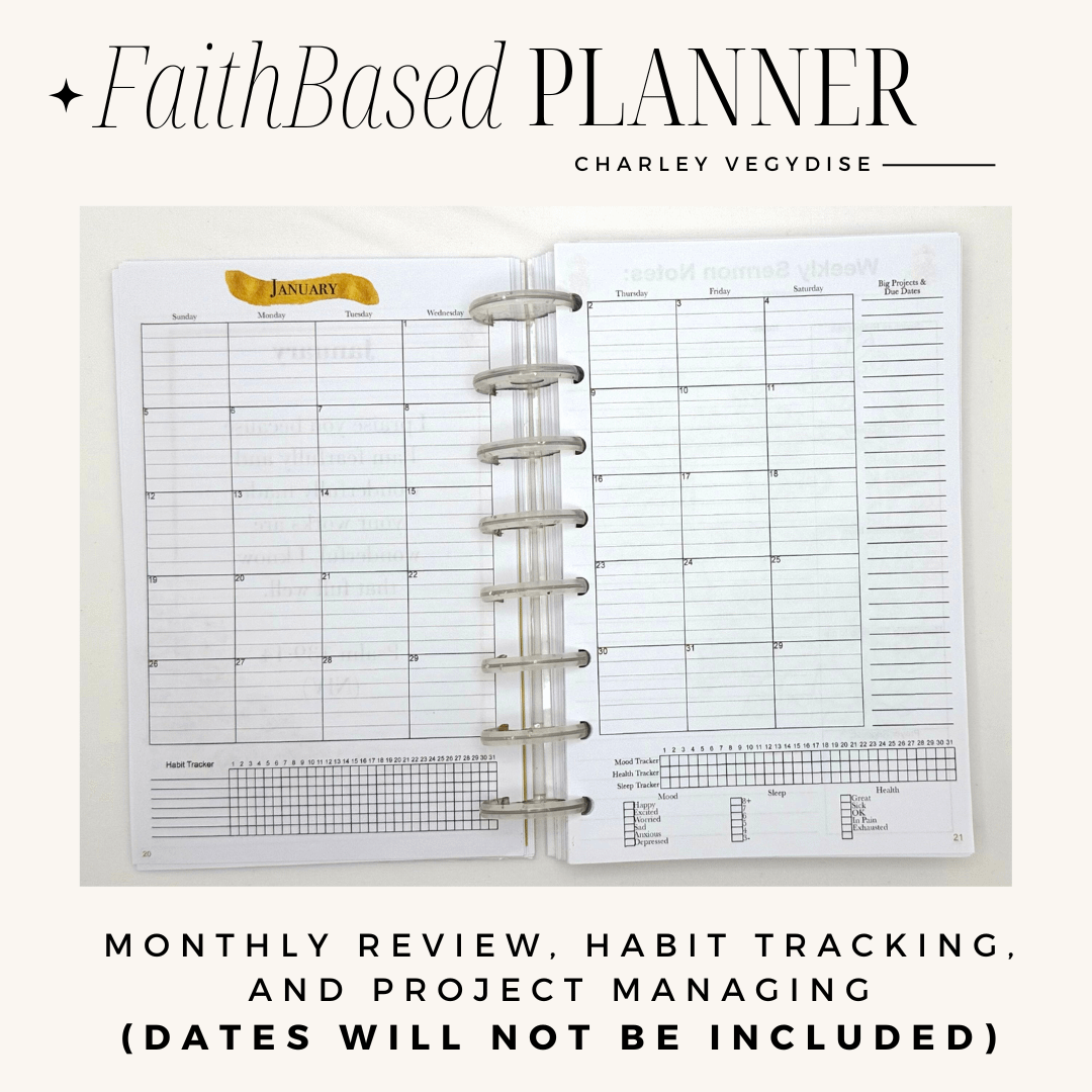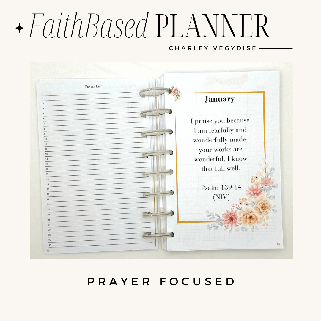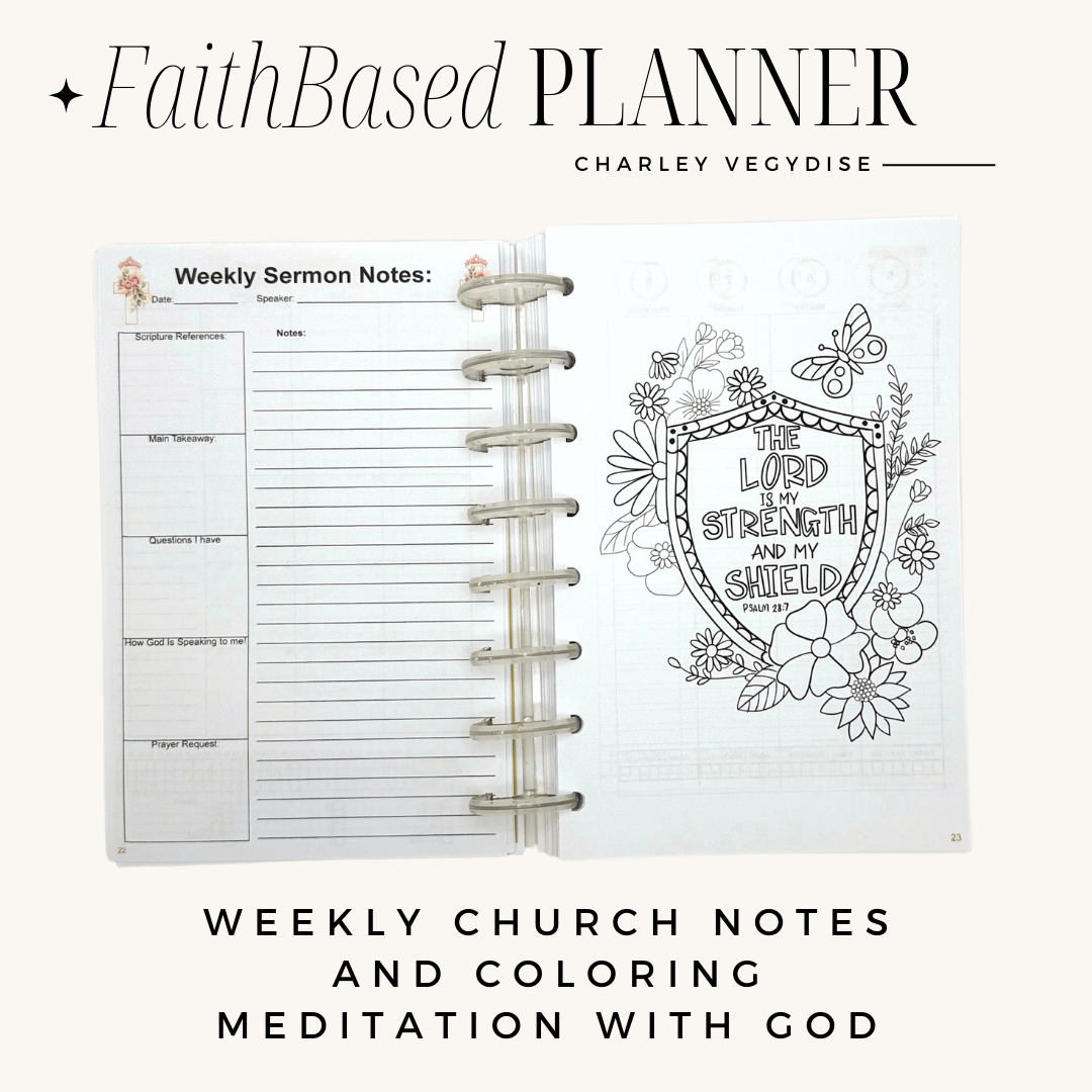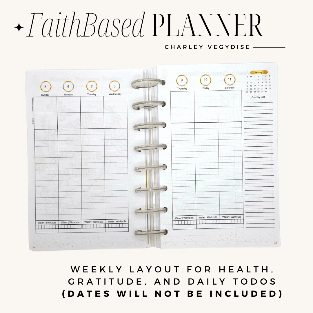 Welcome to the Faith Based Undated Planner – Where faith and handing all of life comes together. No matter what you have going on in your life and day to day, this planner can hold it all. From family, to school, to work, health and wellness, and faith You are able to fully customize this planner to your needs to hold it all.