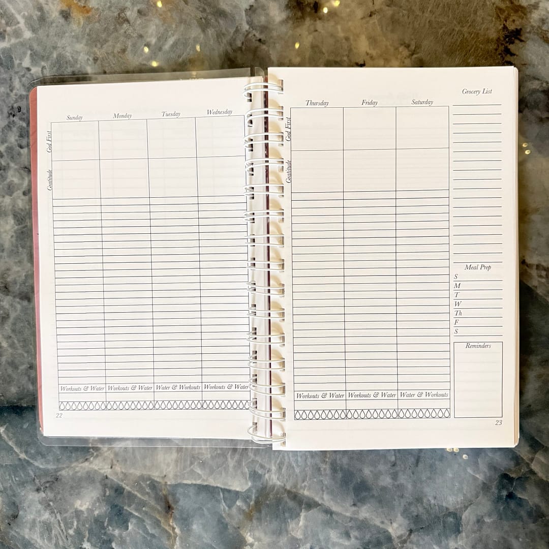 - The Weekly Layout: A “God First” focus at the top of every week, gratitude logs, time-blocking, workout and water trackers, plus a grocery list and meal prep section.