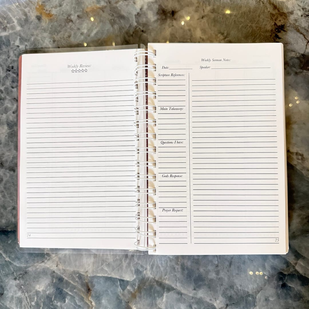 - Sermon Notes & Weekly Reviews: End every week with a deep-dive review (1 to 5 stars) and a full page dedicated to what you’re learning in the world.