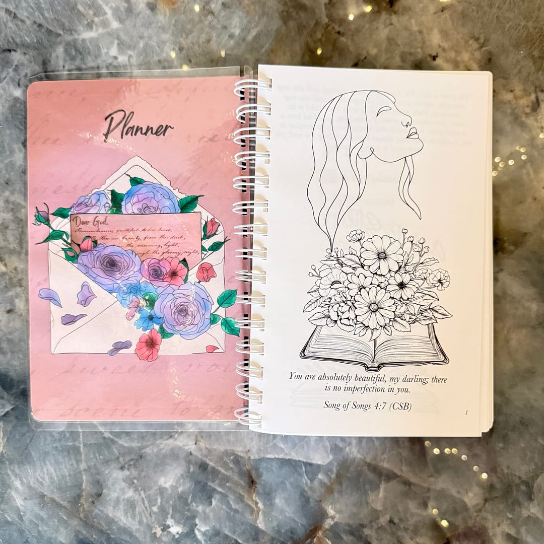 Your journey begins with a heartfelt Letter to God on the front cover, surrounded by stunning artwork. Before you even plan your week, you’re met with the ultimate confidence boost from Song of Songs: “You are absolutely beautiful my darling. There is no perfection in you.”